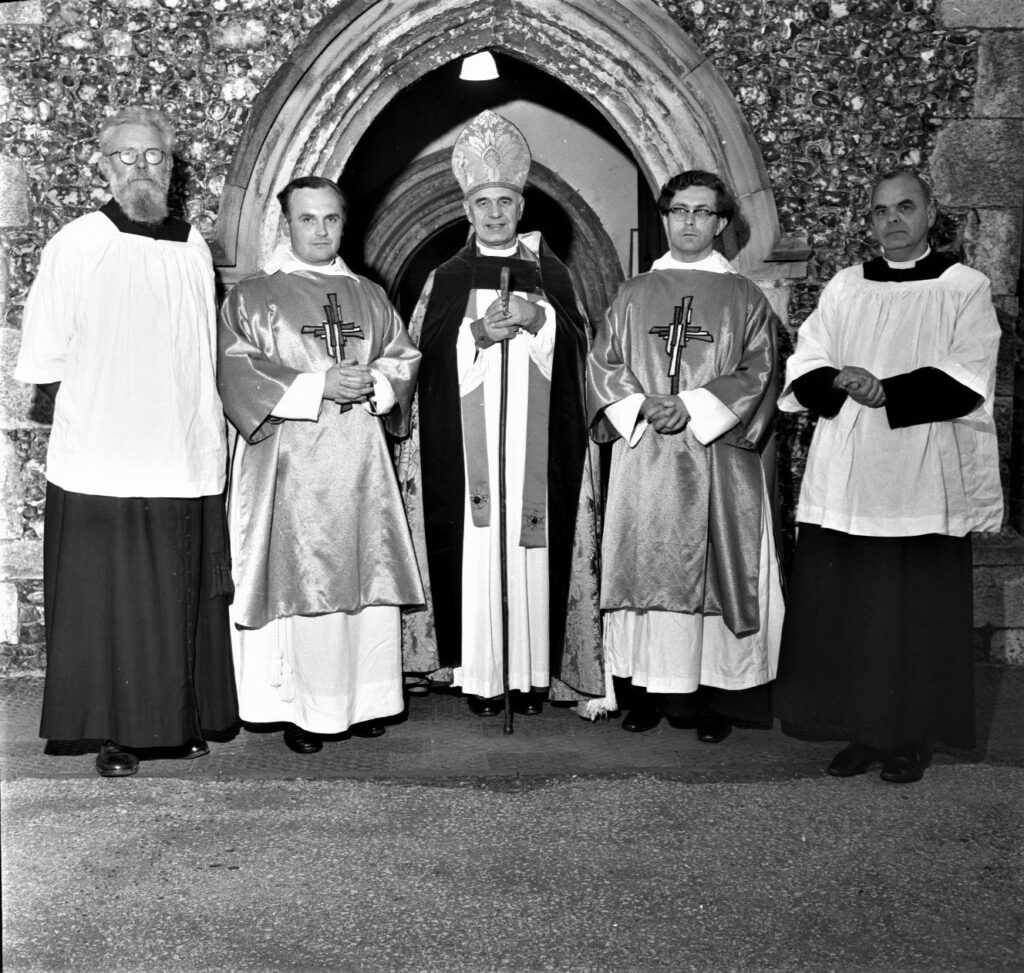 The Very Rev. Arthur Ramsay Archbishop of Canterbury - outside the old Village hall. The boys in the picture are the Matin twins. 1964 - Courtesy of 'Sittingbourne Heritage Museum East Kent Gazette Archive'