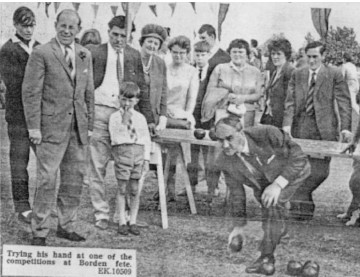 Borden Fete Borden Village Fete Borden Village Fete Maypole Dancers Borden Fete Maypole Dancers Borden Fete Newspaper Clipping Borden Fete Newspaper Clipping Borden Fete Newspaper Clipping Borden Fete Further images of Borden Fete – courtesy of Malcolm Valentin Borden Fete : Opened by Mrs Lisbeth Valentin ‘Guard of Honour’ by the R E band ?Chatham Borden Fete – SFV (John Valentin) Bowling for the pig (one year he won!) (from EKG photos) (note the dreadful hat!!) Father’s pride and joy, the Austin Princess